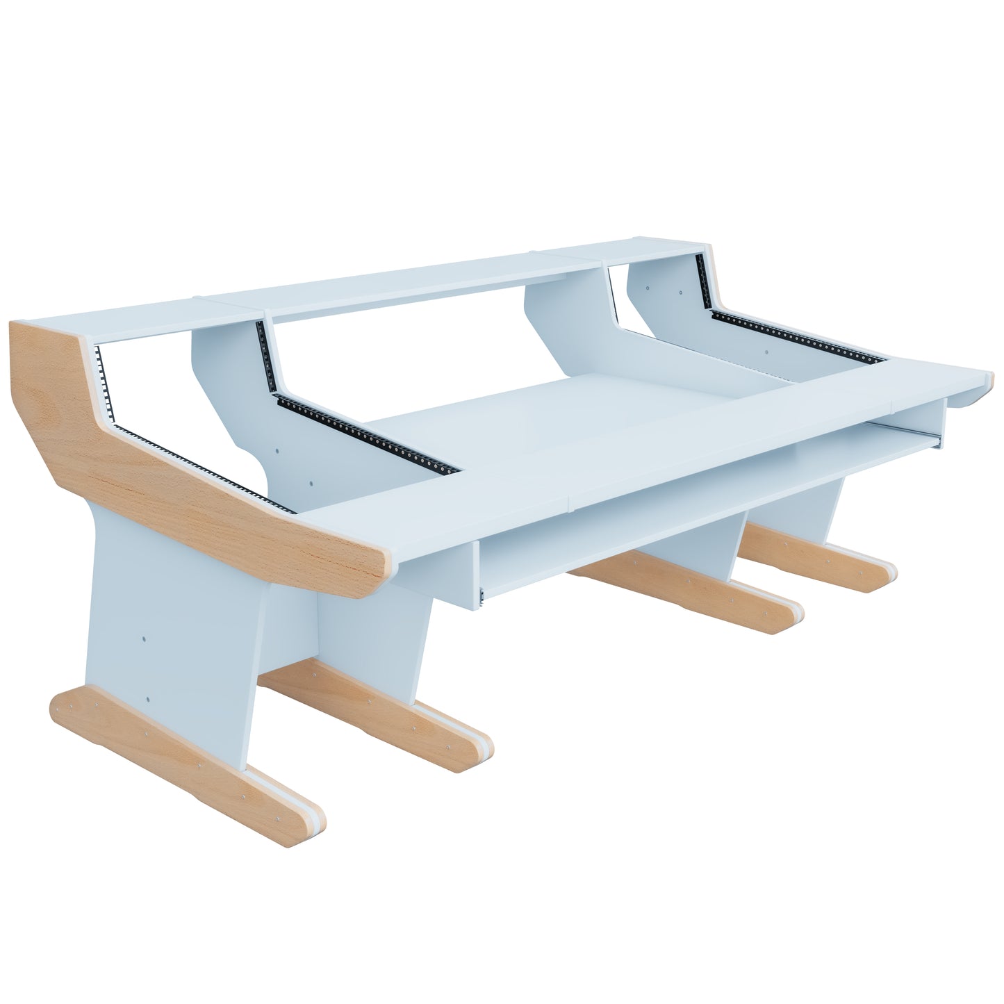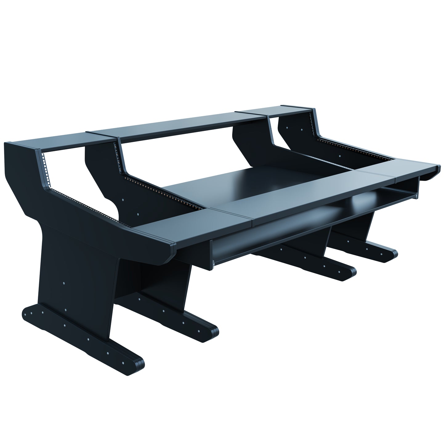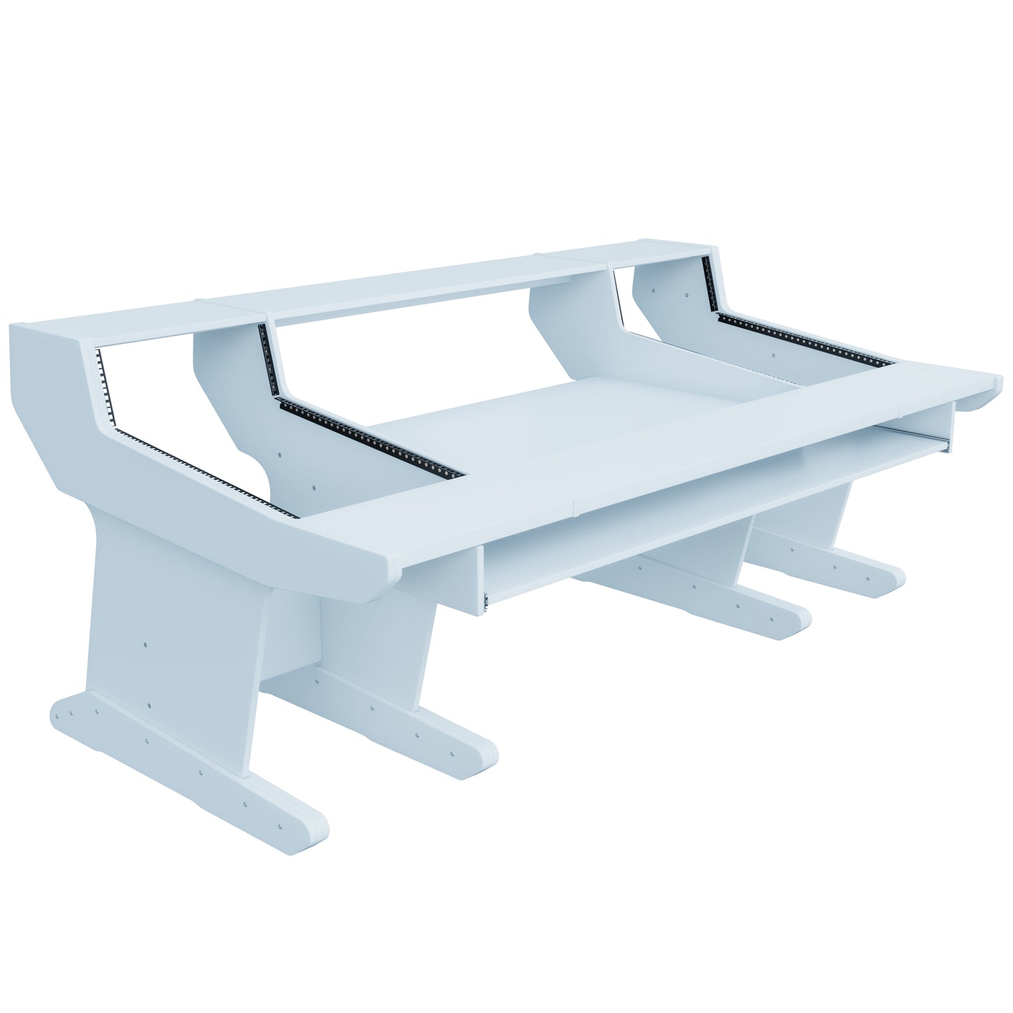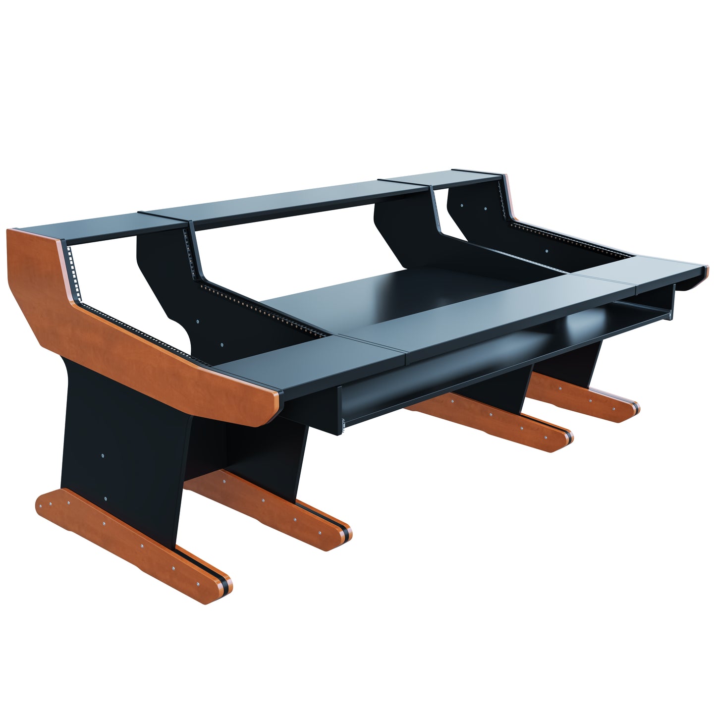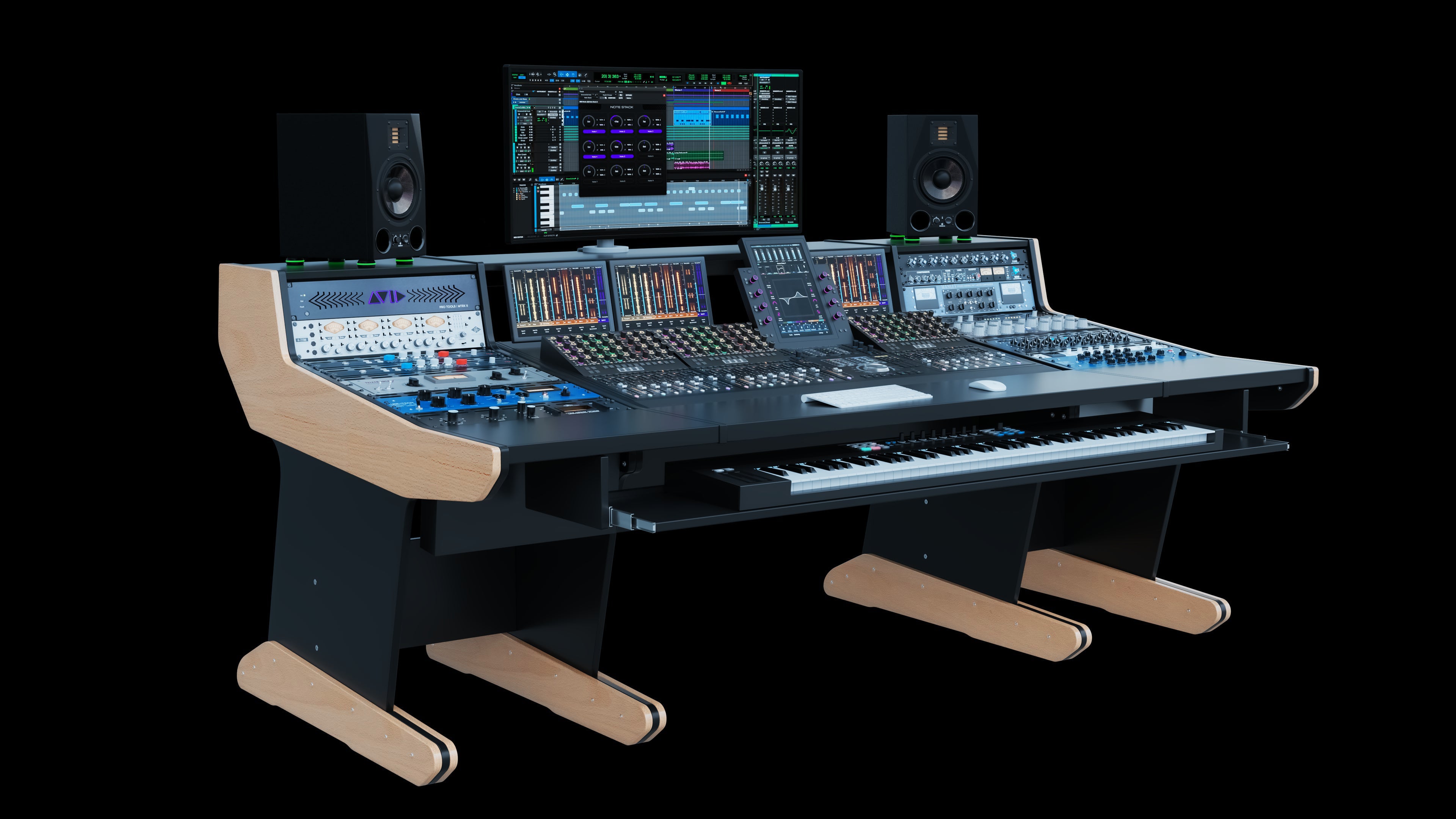 Our Avid S4 console workstation is designed with our classic console desk design in mind, offering 2x19U rack space on each side. The top shelf provides room for monitors and screens, while the desktop offers ample space for tabletop devices, along with a mouse and keyboard.