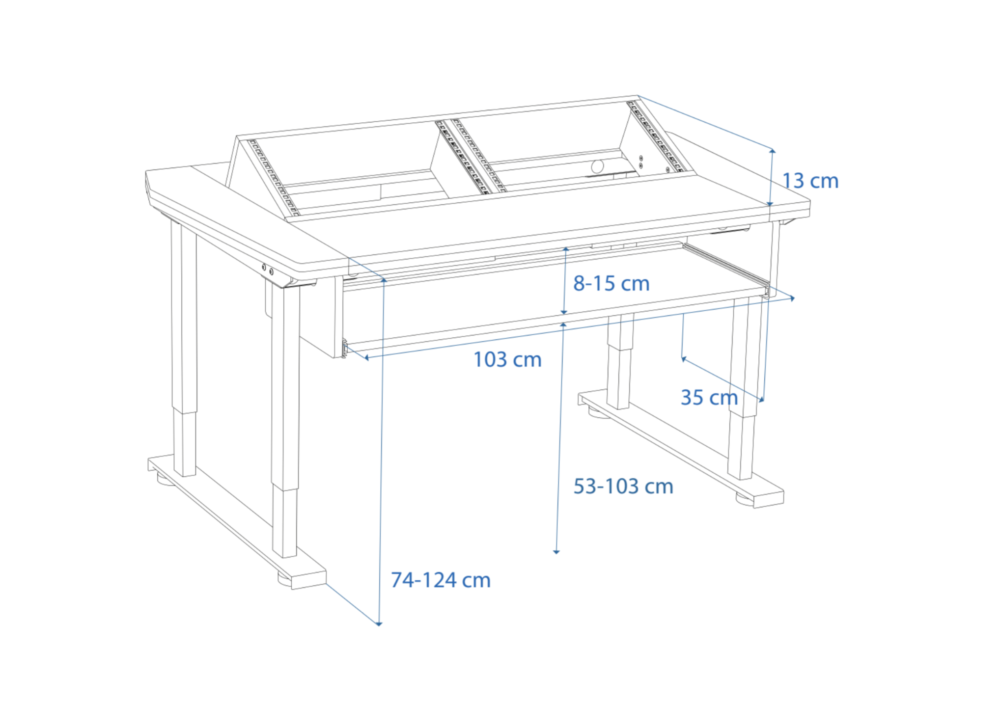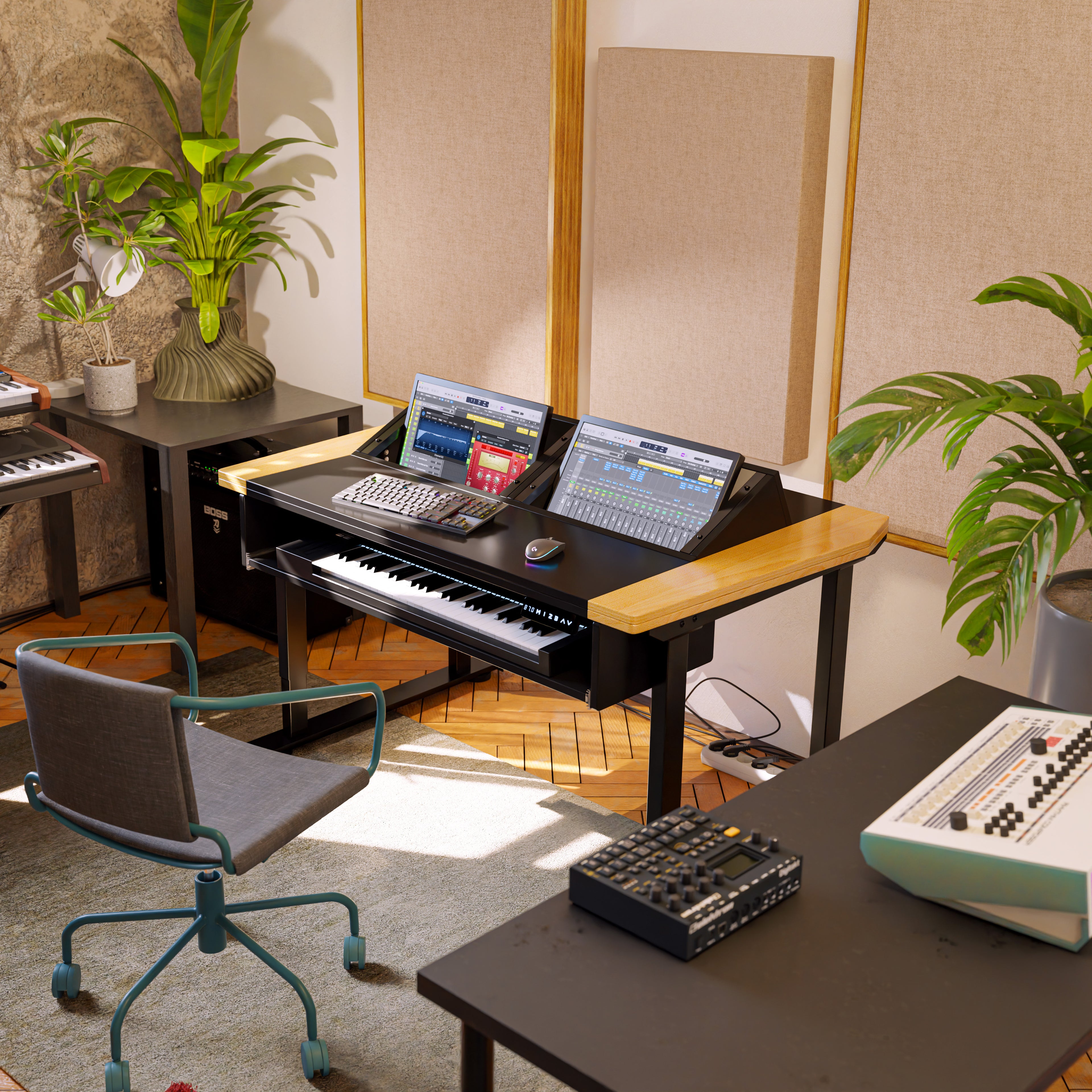 This innovative desk is designed to adapt effortlessly to your workflow, smoothly transitioning between sitting and standing positions. It offers ample legroom and fosters an active, ergonomic work environment. With 2x6U rack space and a height-adjustable 61-key keyboard tray, the Producer 2 Rise Pro is ideal for a hybrid analog-digital setup.
