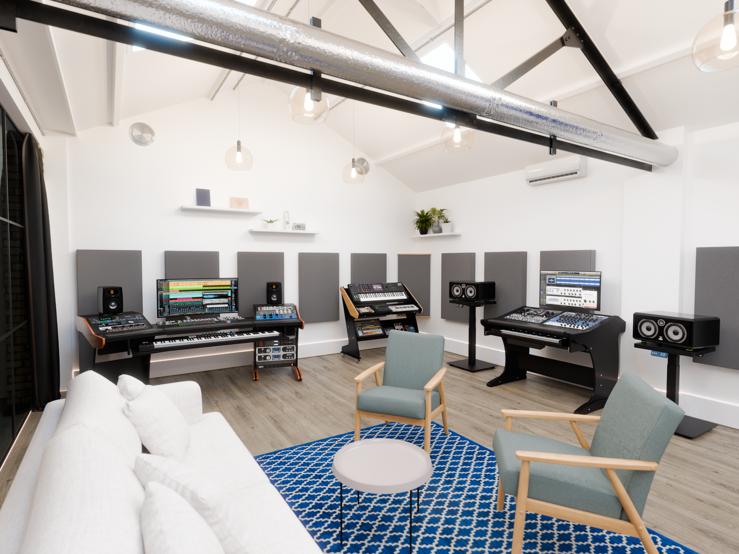 Our London showroom at the Tileyard showcases 4-5 workstation setups with assorted gear to test. Equipment is regularly switched out, so verify stock before scheduling. Refreshments are available for a pleasant visit!