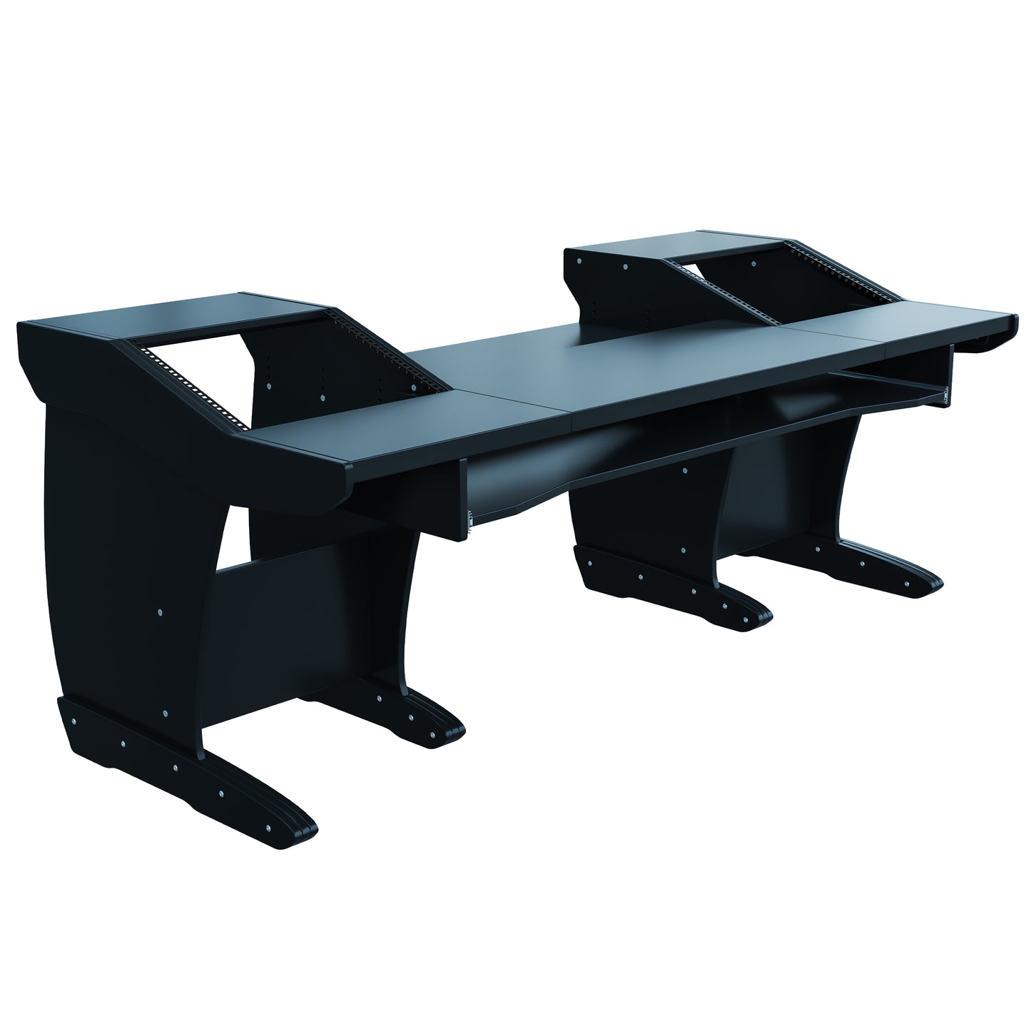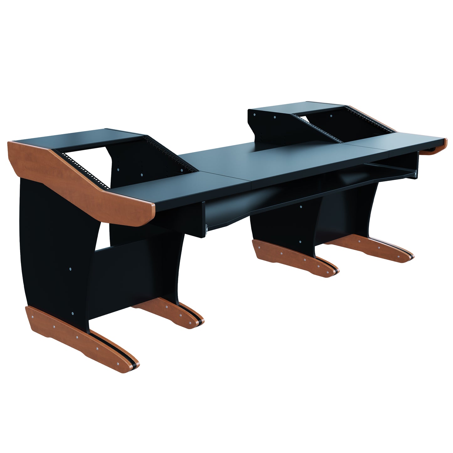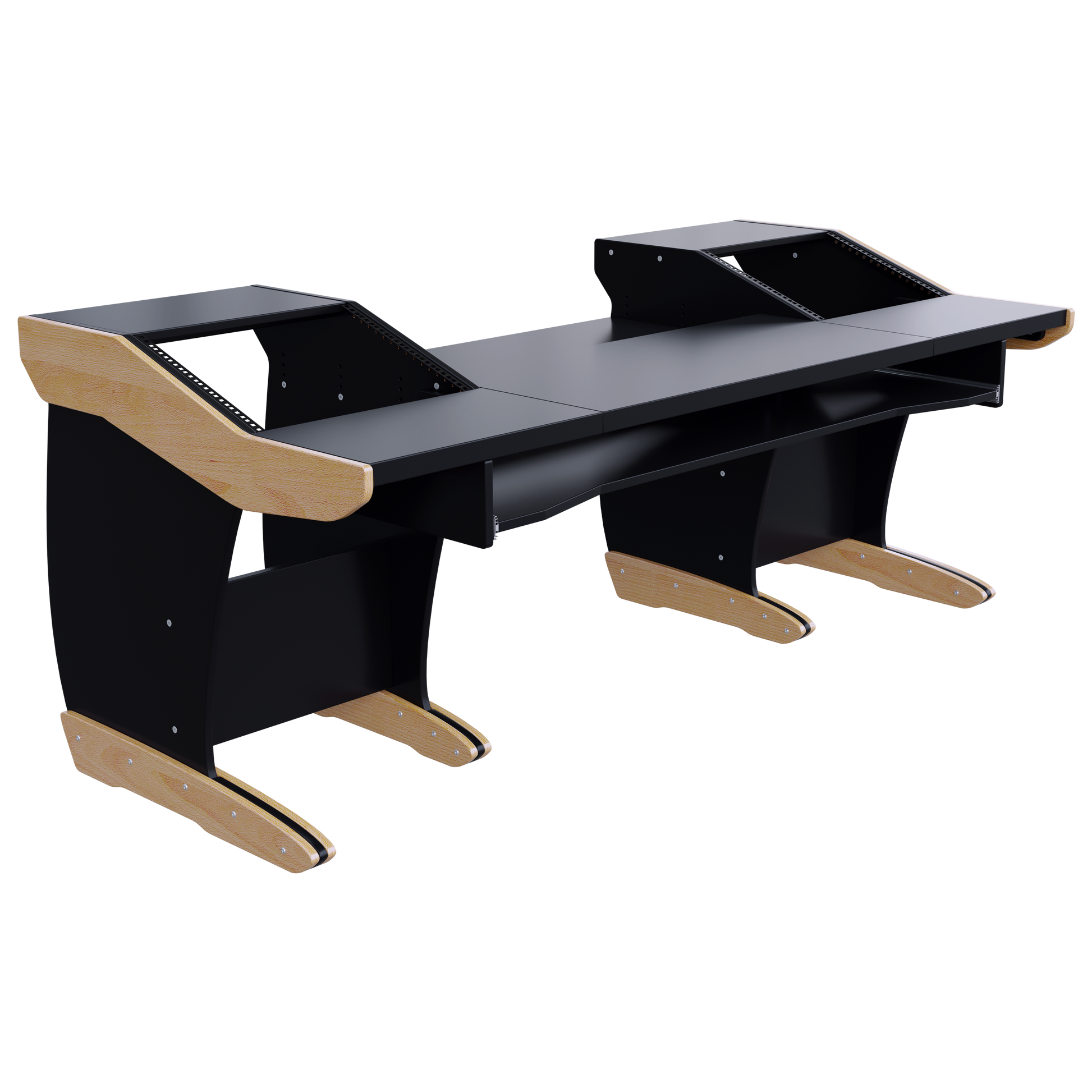 Take advantage of the split-level desktop and install the rear half of the desktop recessed at different heights, at an angle, or flat. This is perfect for a variety of tabletop devices and DAW controllers.