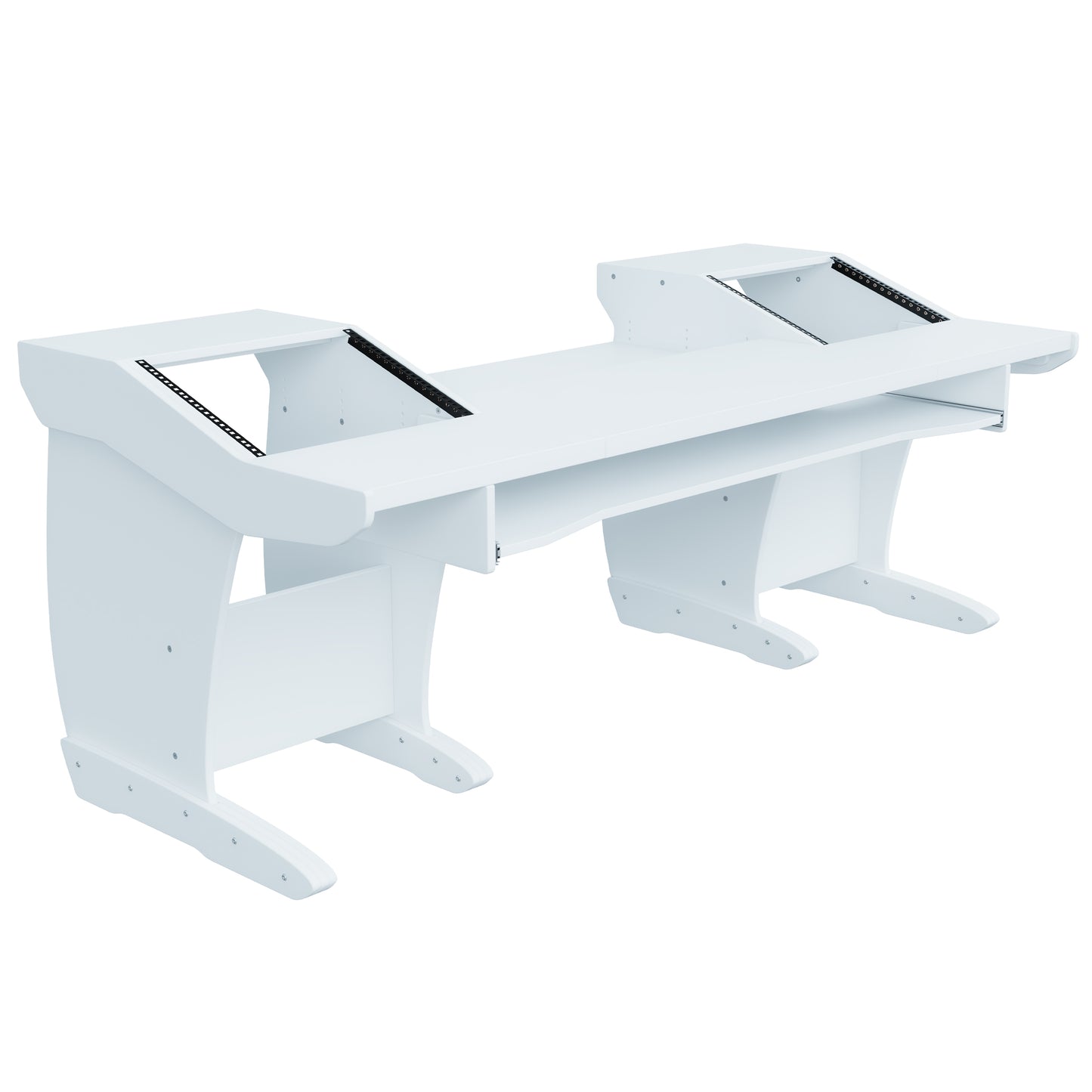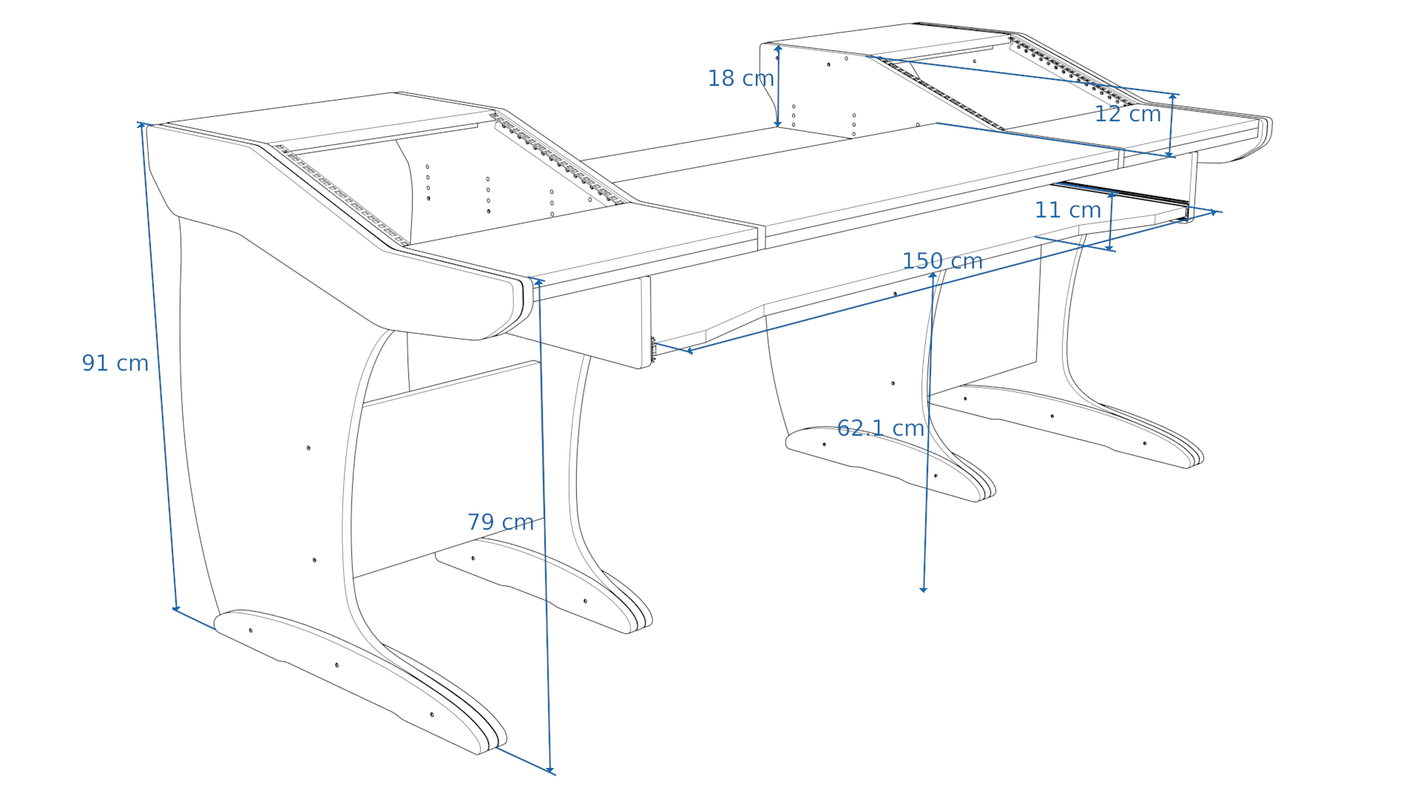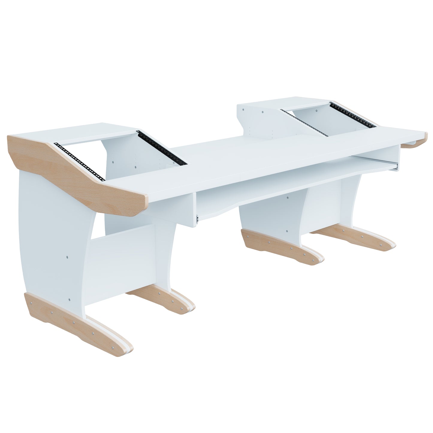 Take advantage of the split-level desktop and install the rear half of the desktop recessed at different heights, at an angle, or flat. This is perfect for a variety of tabletop devices and DAW controllers.