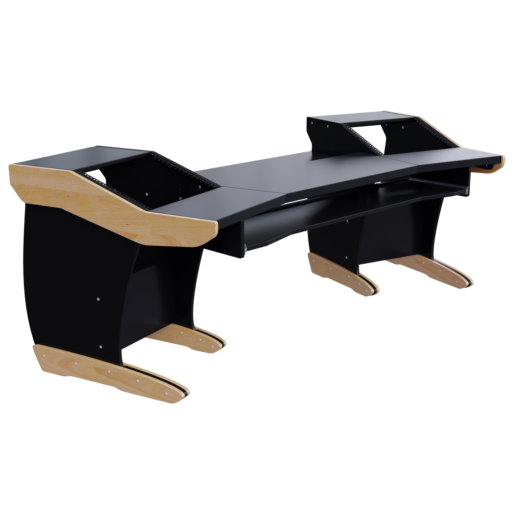 Take advantage of the split-level desktop and install the rear half of the desktop recessed at different heights, at an angle, or flat. This is perfect for a variety of tabletop devices and DAW controllers.
