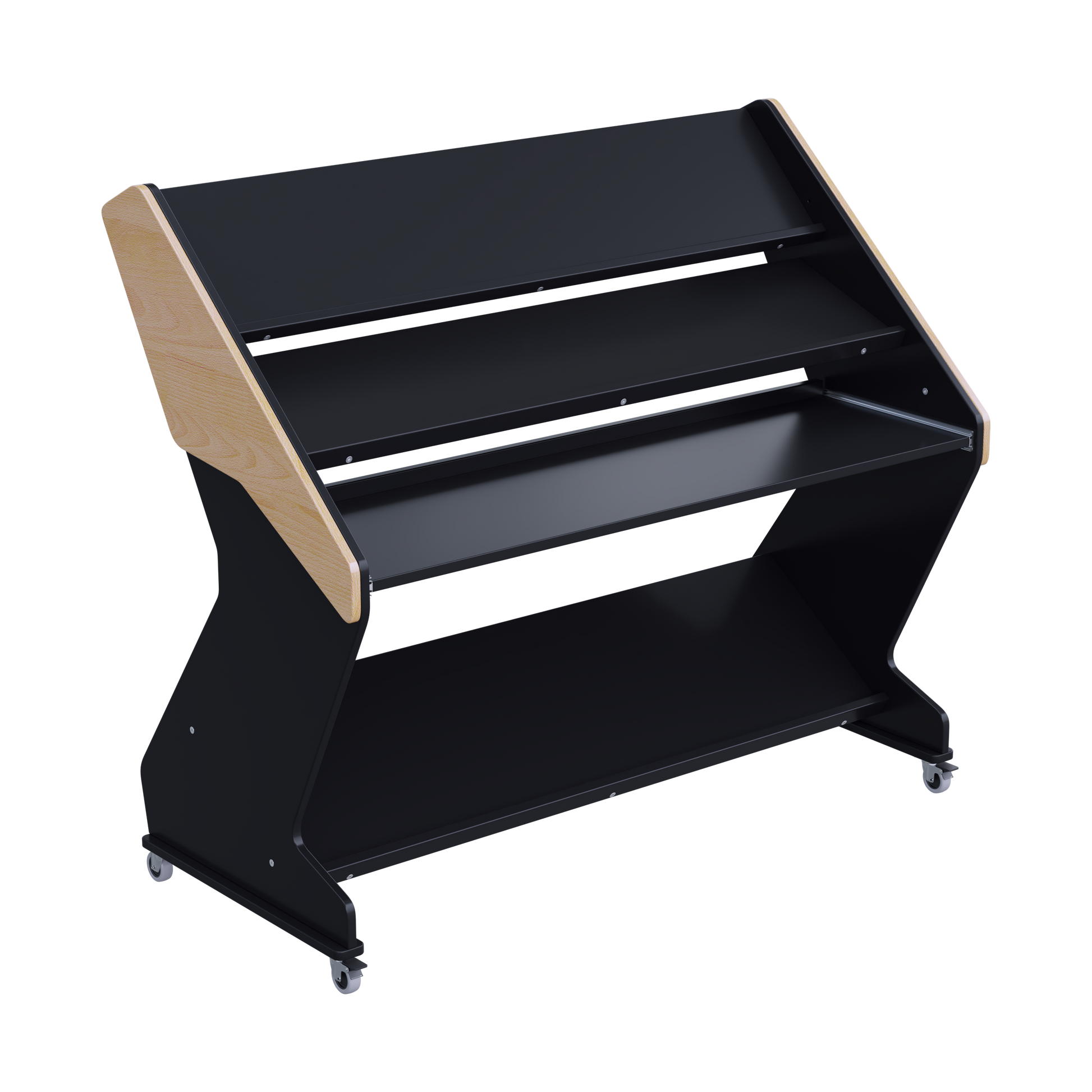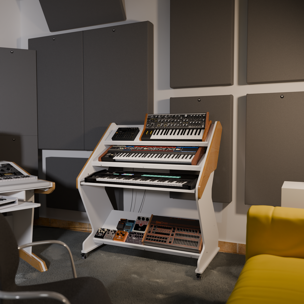 Keep your creative space optimized with our Synthstation Pro. Featuring three tiers of specialized storage, including two adjustable-angle top shelves and a smooth-glide pull-out tray, it is engineered to put your entire setup within arm's reach. Enhance your studio flow with a design focused on ergonomics and effortless access.