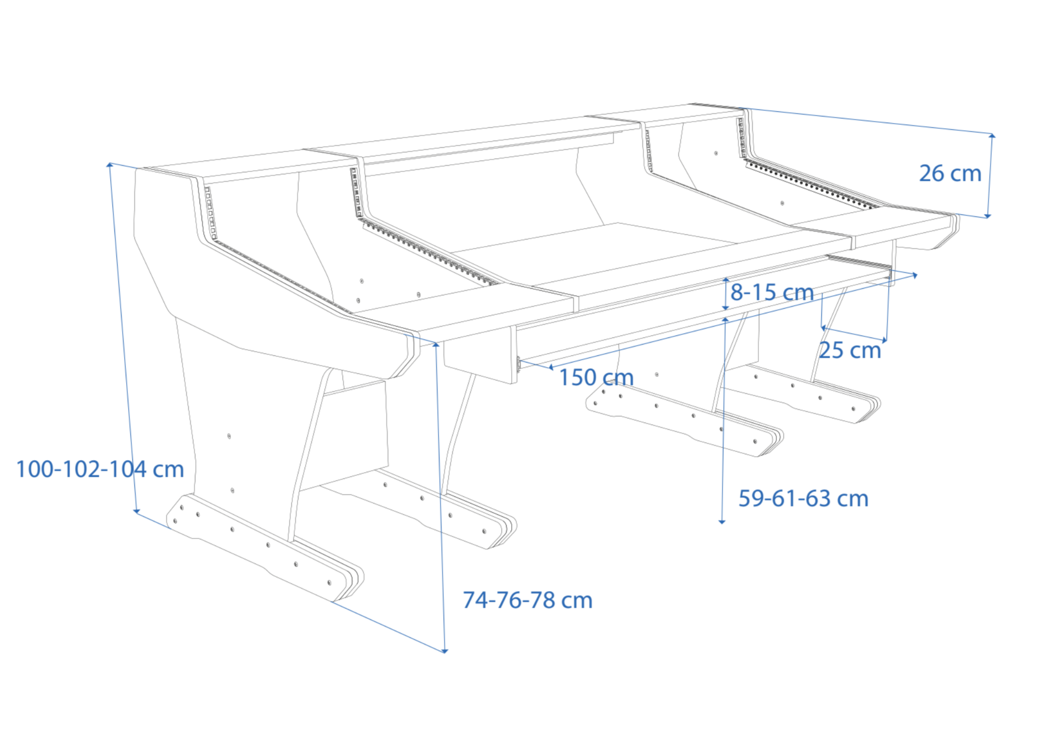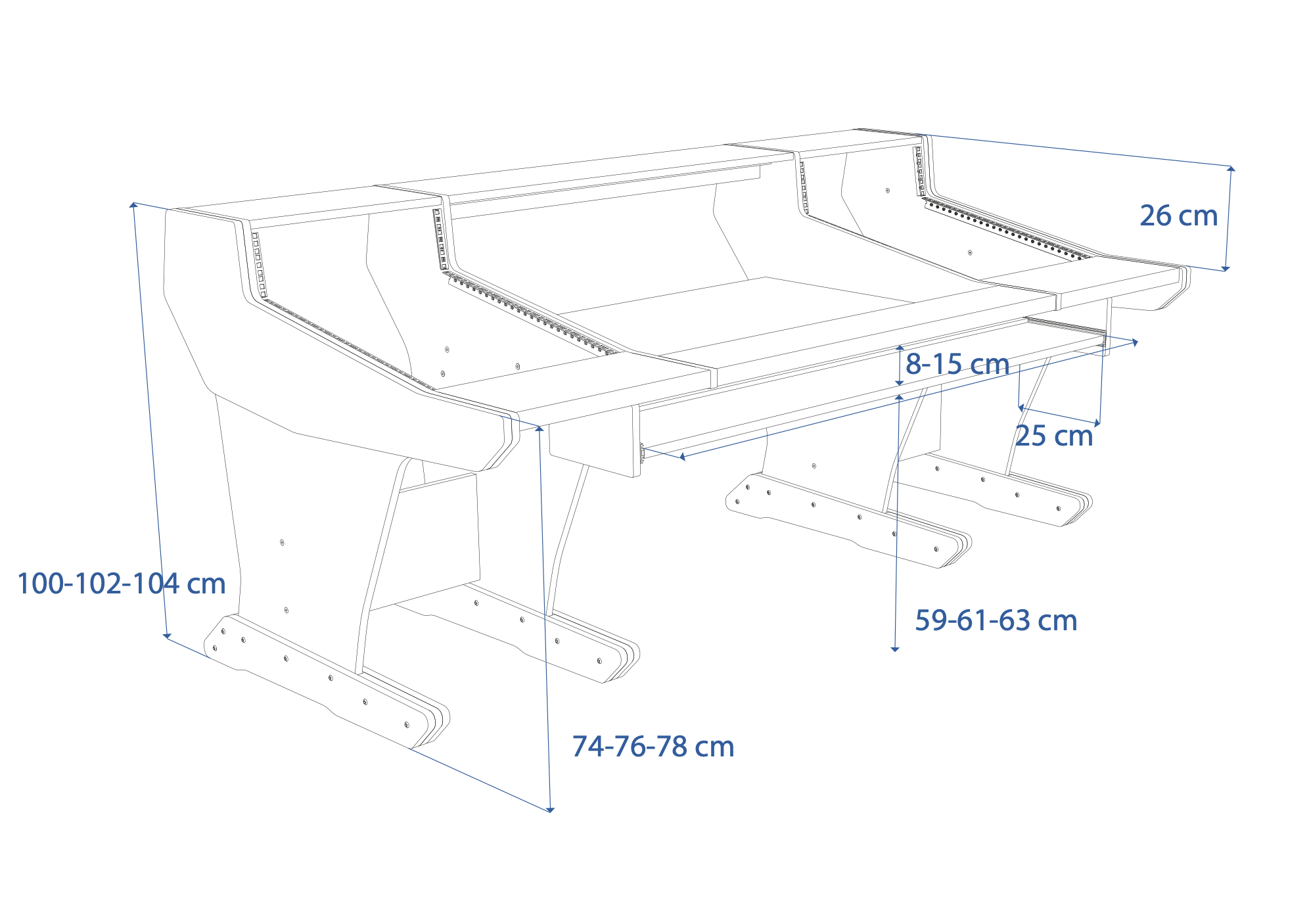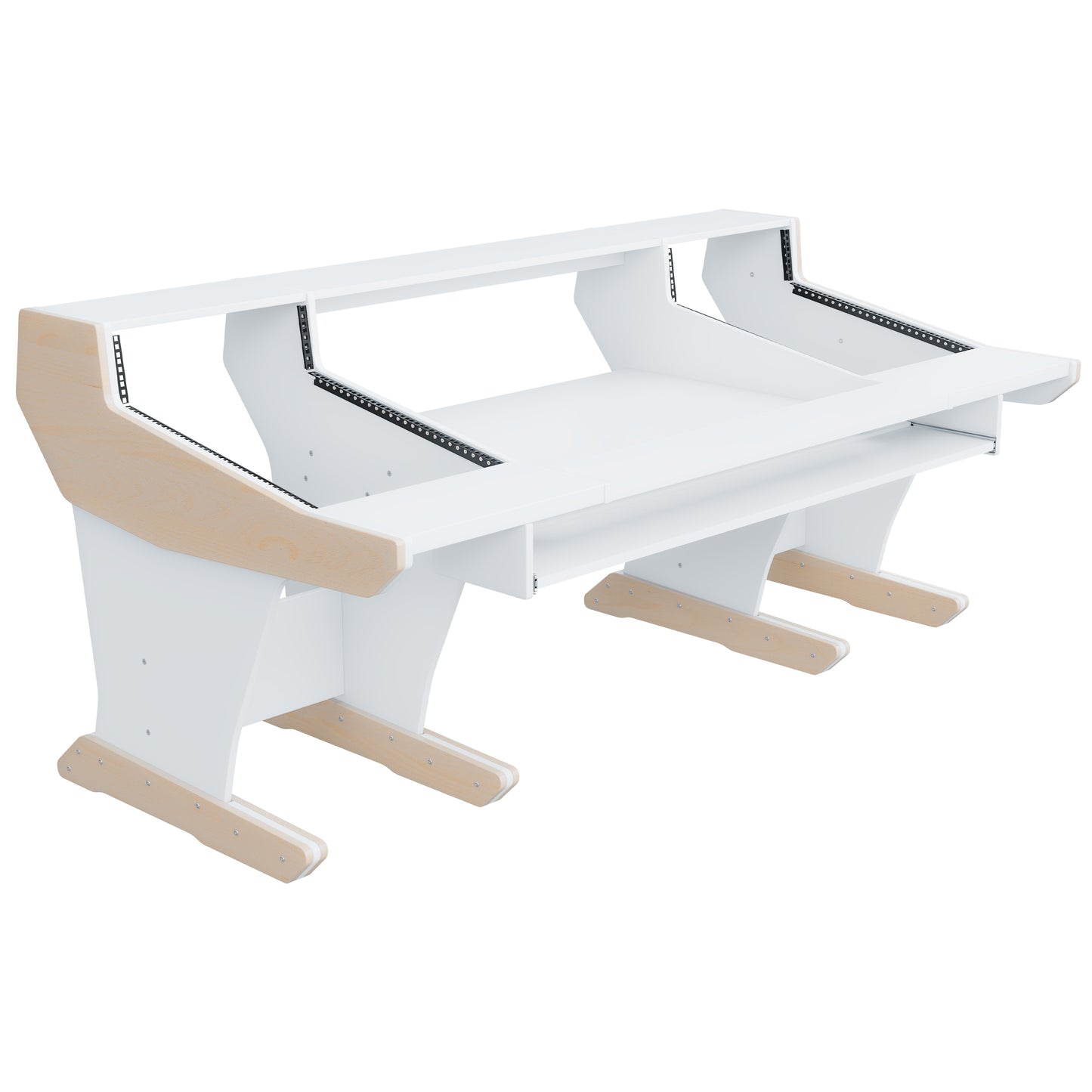 Following the classic lines of the console, our workstation for the Trident 78 series gives you 2x16U rack space on both sides of the console. The wide top shelf adds space for monitors and screens. The desktop gives you room for tabletop devices and a mouse and keyboard.