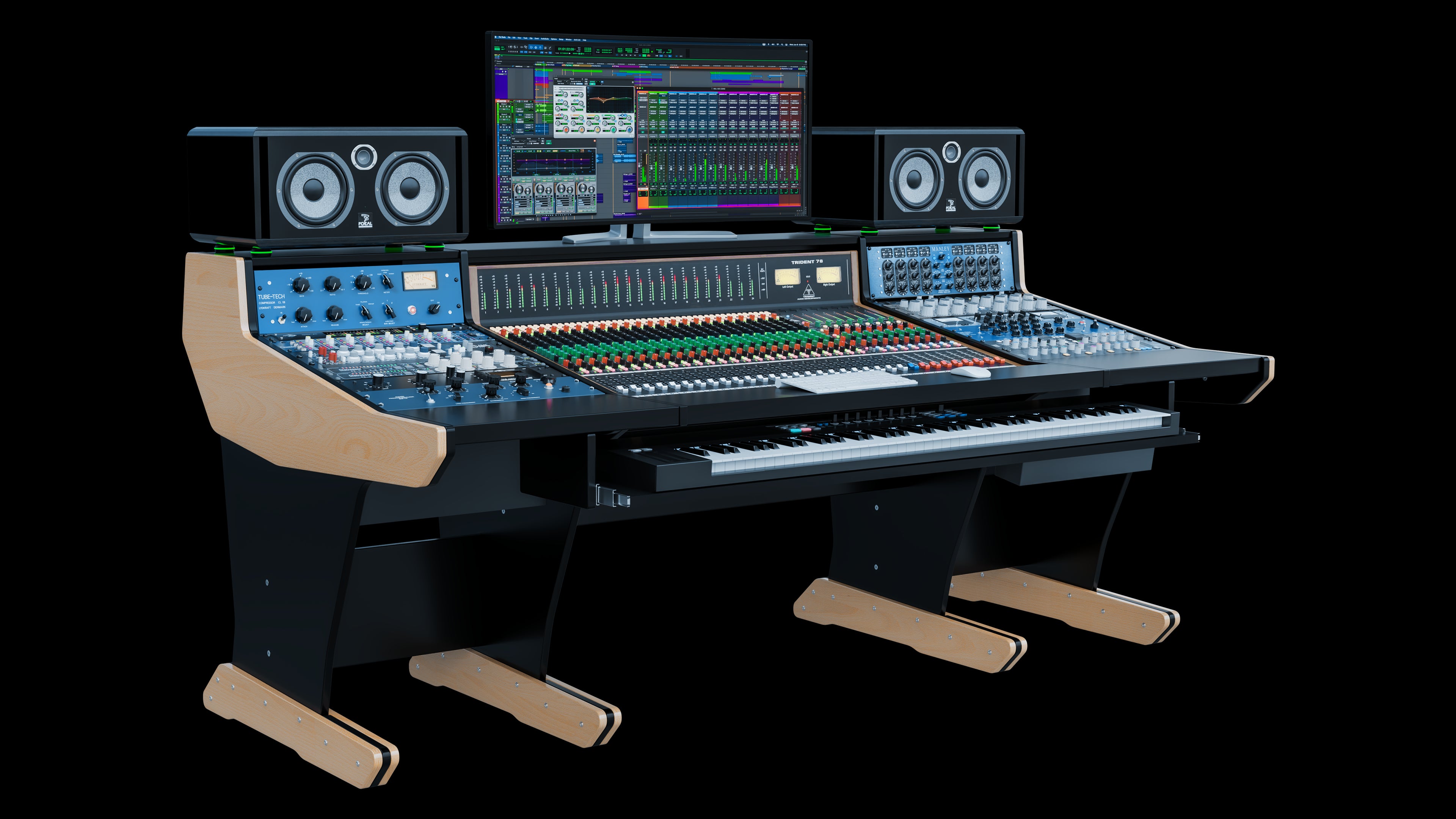 Available for the 16, 24 and 32 channel consoles with an optional keyboard tray, the Trident 78 console workstation is adaptable to any situation in the studio.